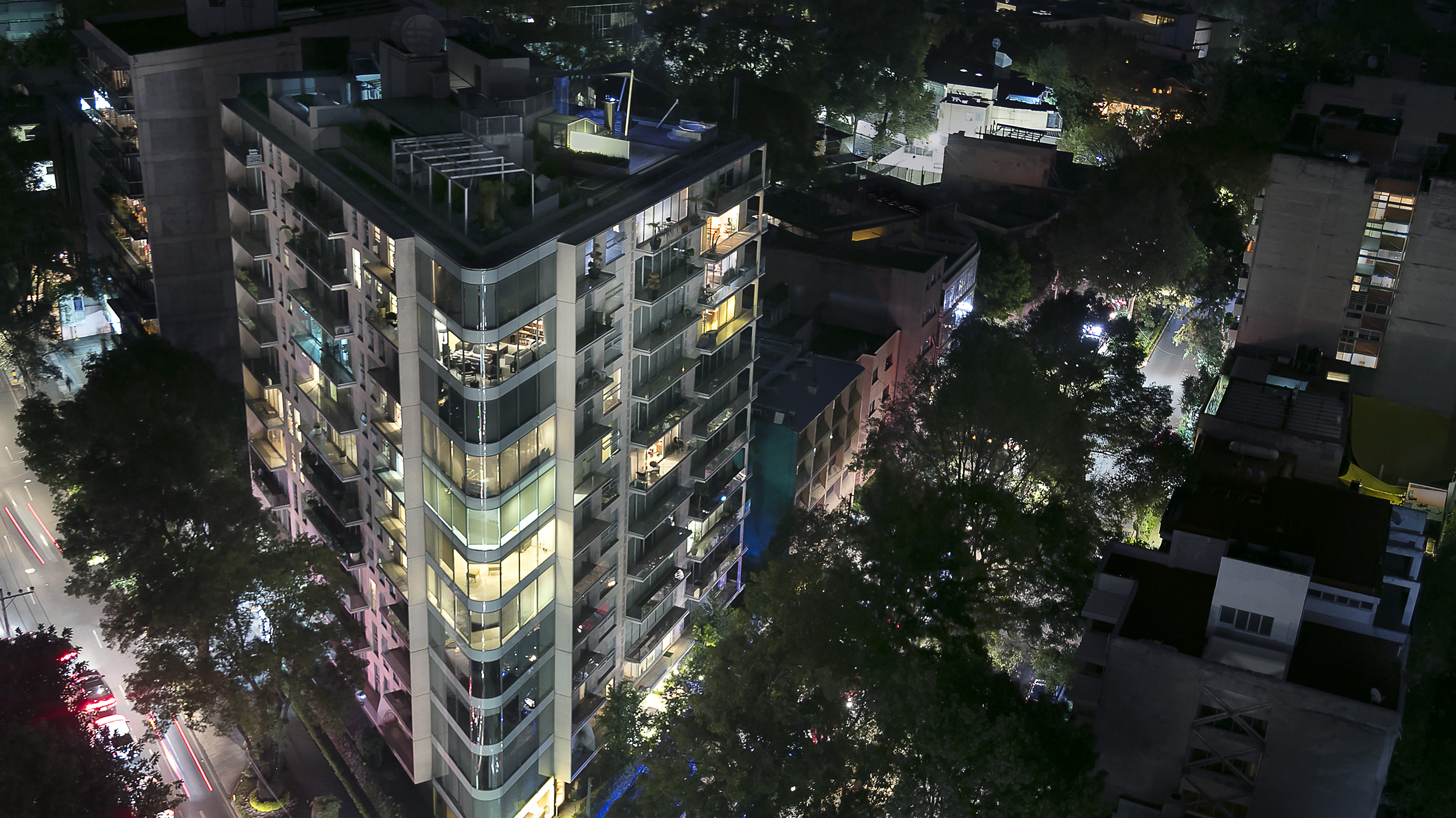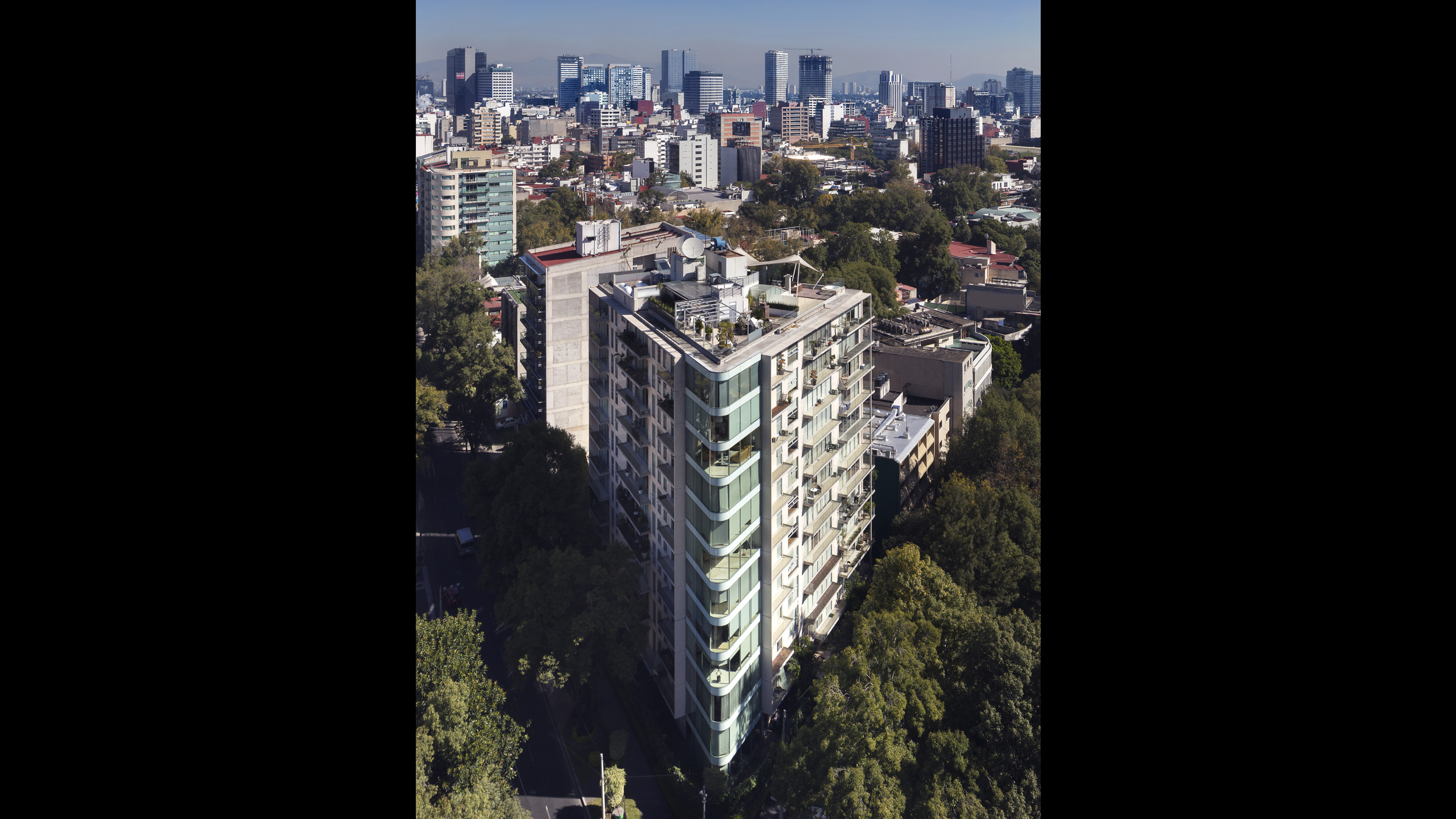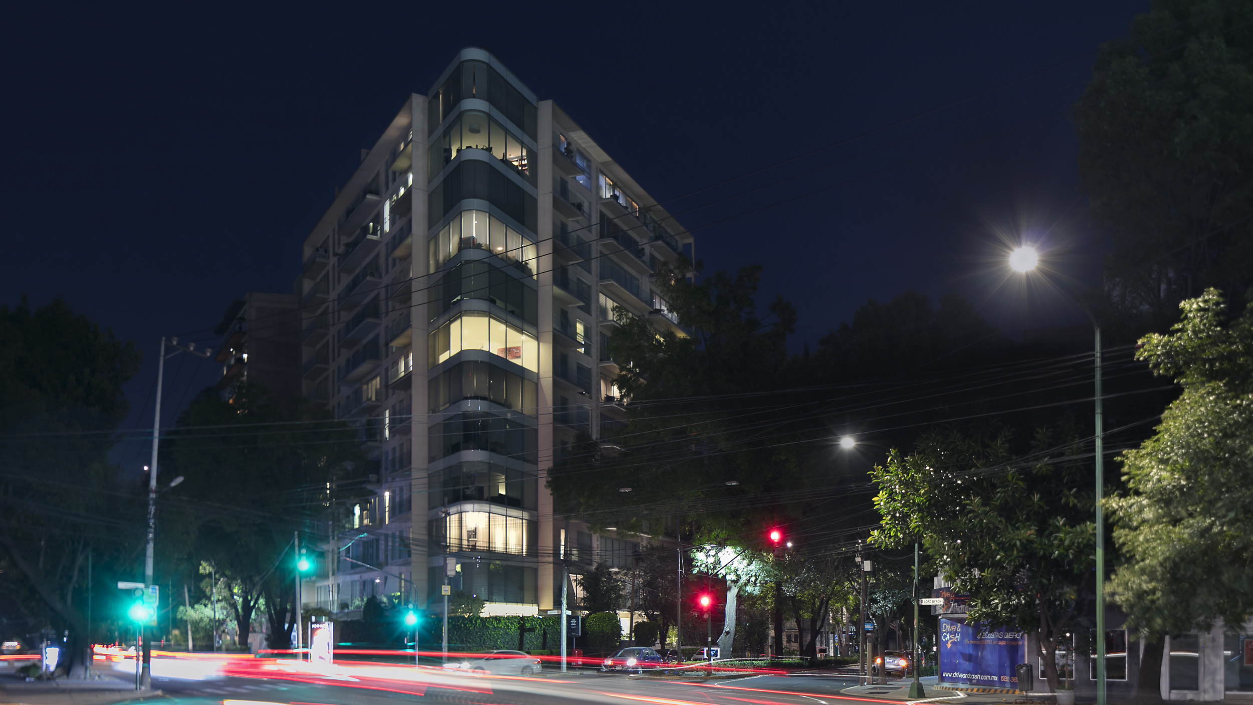 • La fachada mixta combina muros macizos con ventanas y cuenta con balcones para todos los departamentos, enfatizando su vista hacia la avenida Campos Elíseos y provocando la interacción entre el exterior e interior.