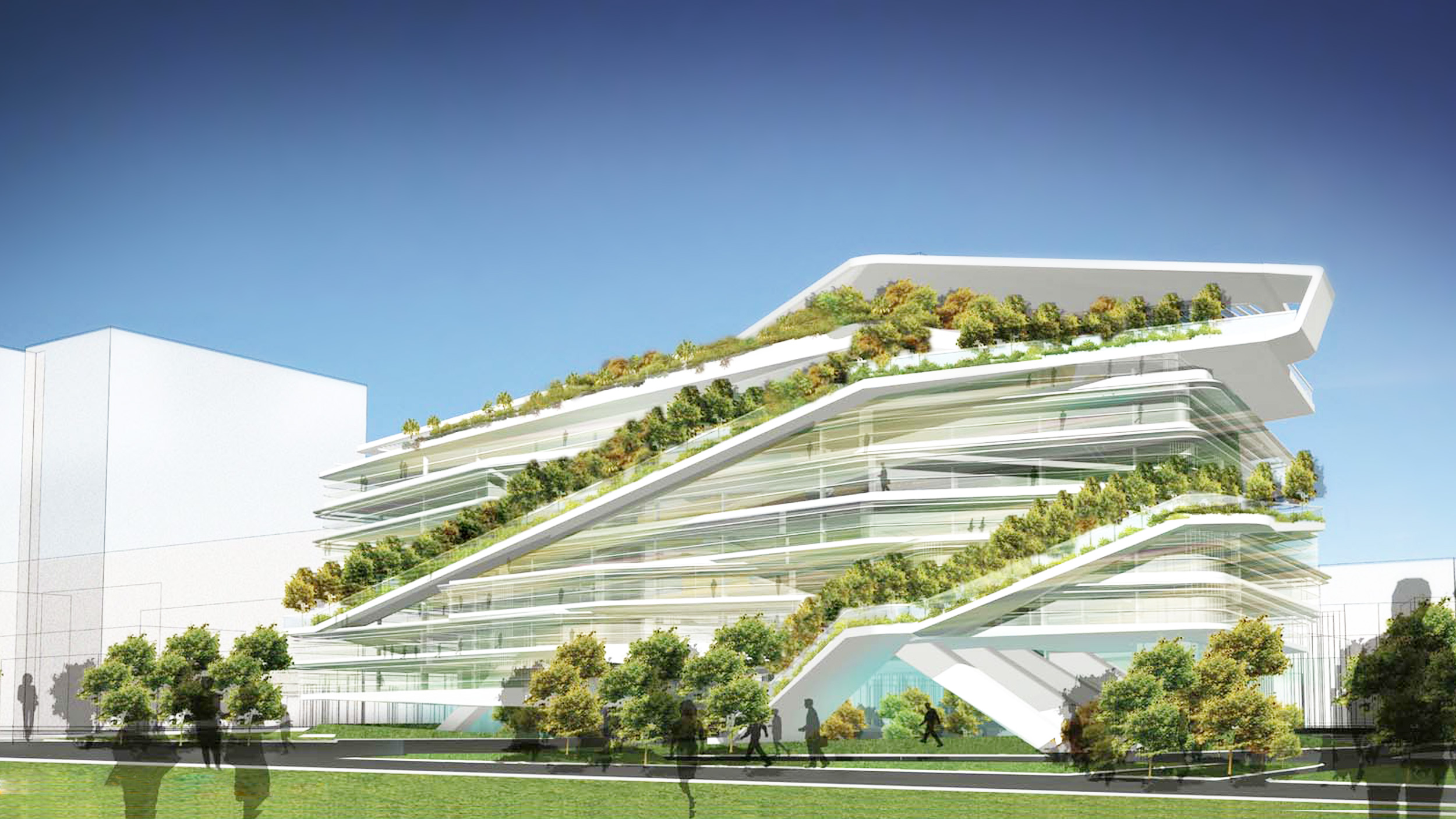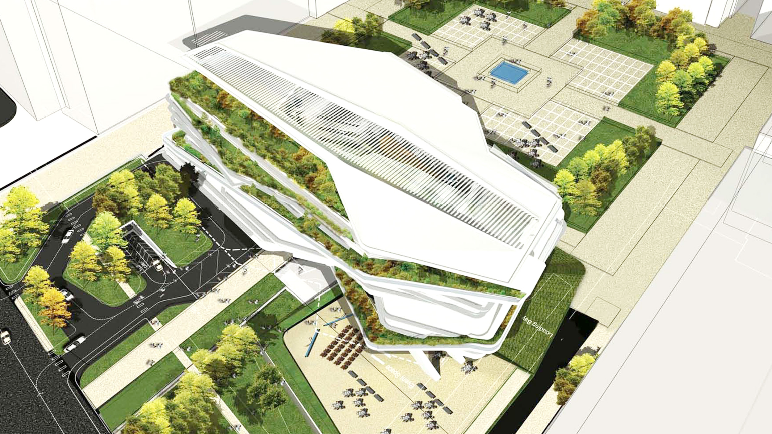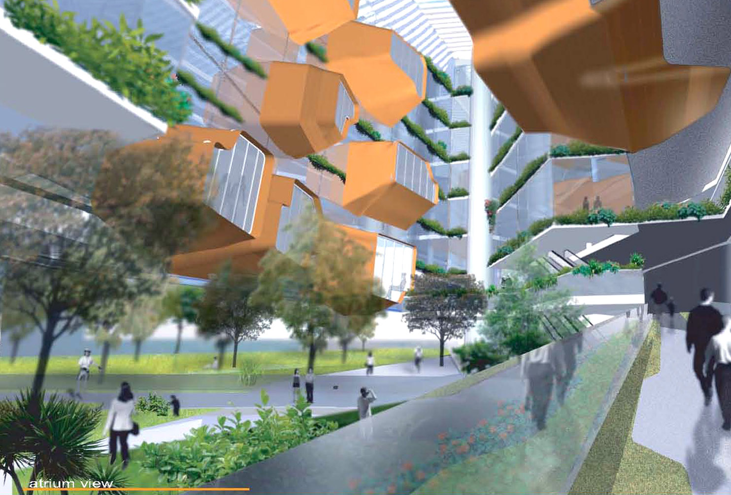 • El concepto arquitectónico incorporó rampas verdes que recorren el edificio en forma de espiral, creando una visión continua de vegetación, desde la base hasta el techo, tanto en el interior como el exterior, se pretendió elevar a 3era dimensión la plaza existente.