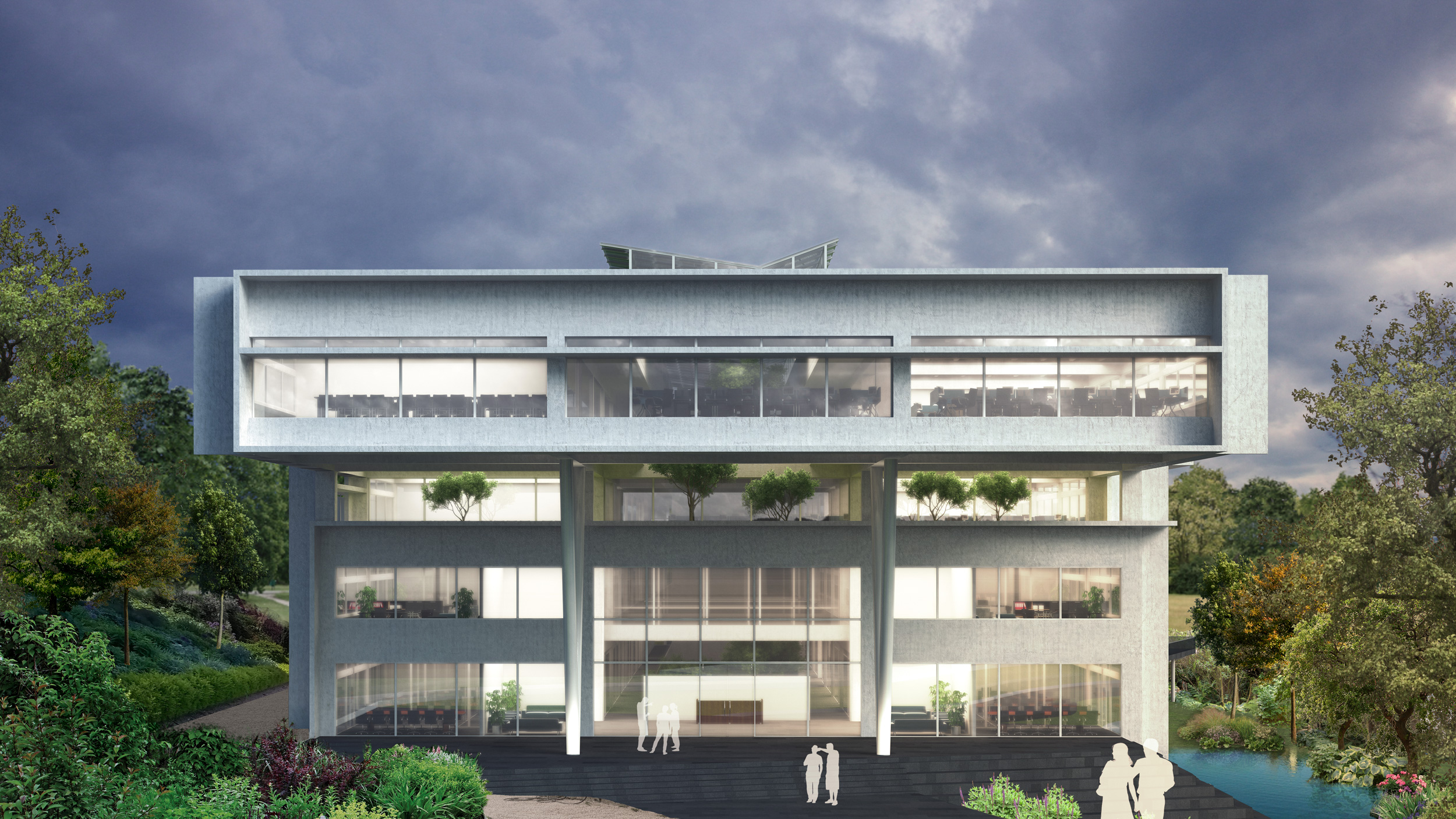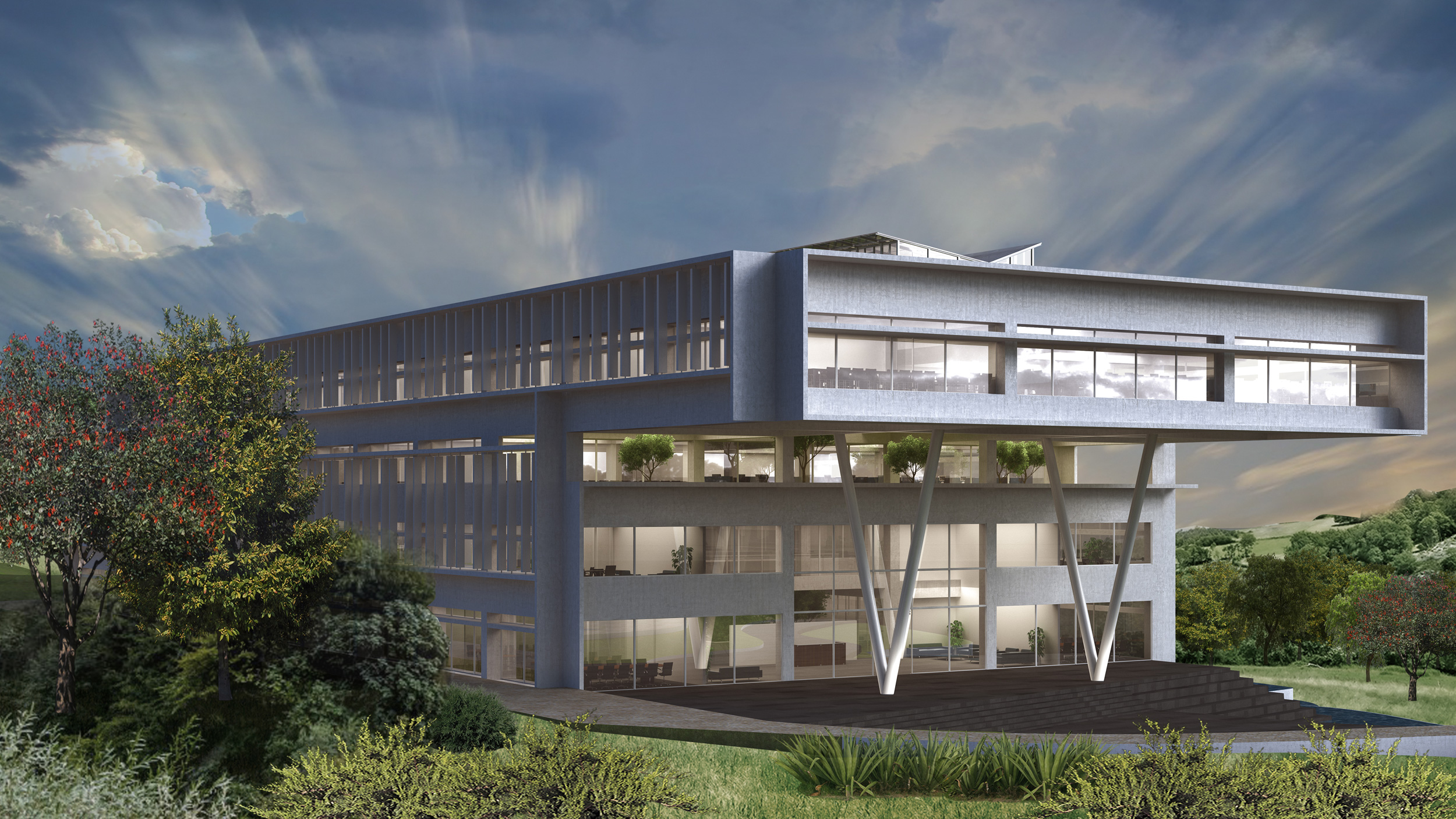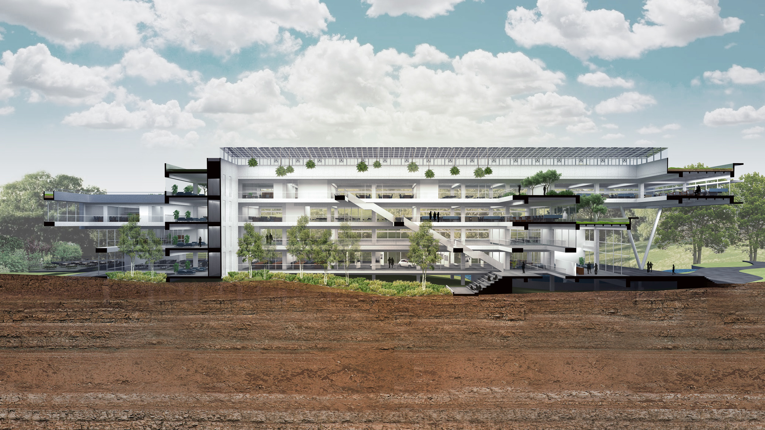 • El edificio se compone de un prisma rectangular compuesto por 4 niveles, insertado en un terreno a través de calzas elevándolo del suelo, cuidando el crecimiento interno de los árboles. Logrando con esto un gran patio inferior que funciona como eje rector del edificio, el cual tendrá como función ventilar, iluminar y dar vida al espacio interior, además de organizar las circulaciones y la relación en todos los espacios.