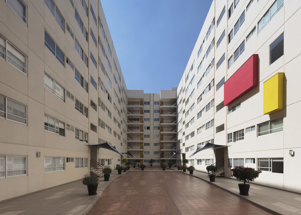 • Está conformado por cuatro bloques que giran alrededor de un gran patio central que funciona como elemento rector que organiza y gestiona todo el conjunto, permitiendo las dobles vistas y la iluminación por el lado sur de los departamentos orientados al norte.