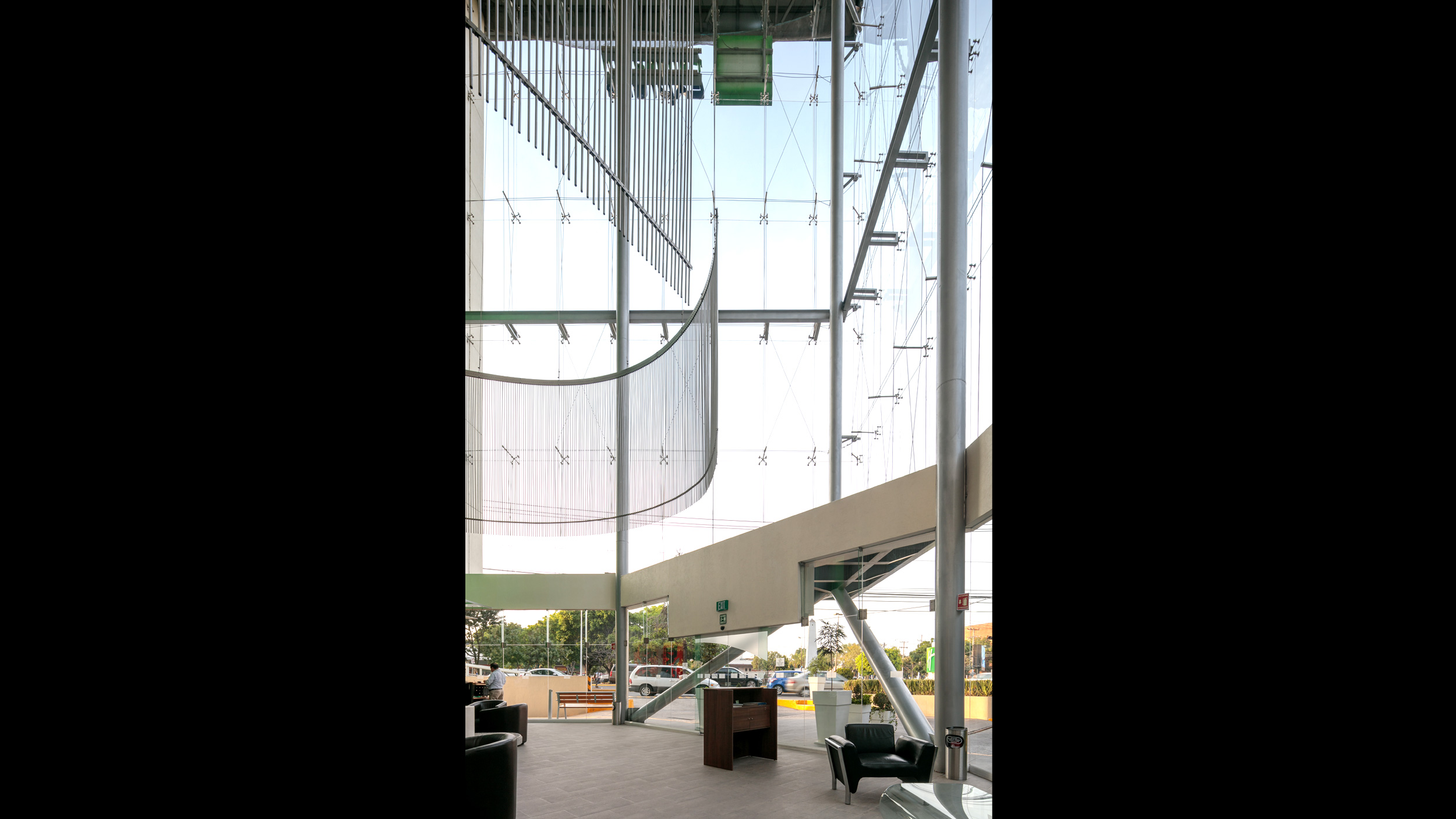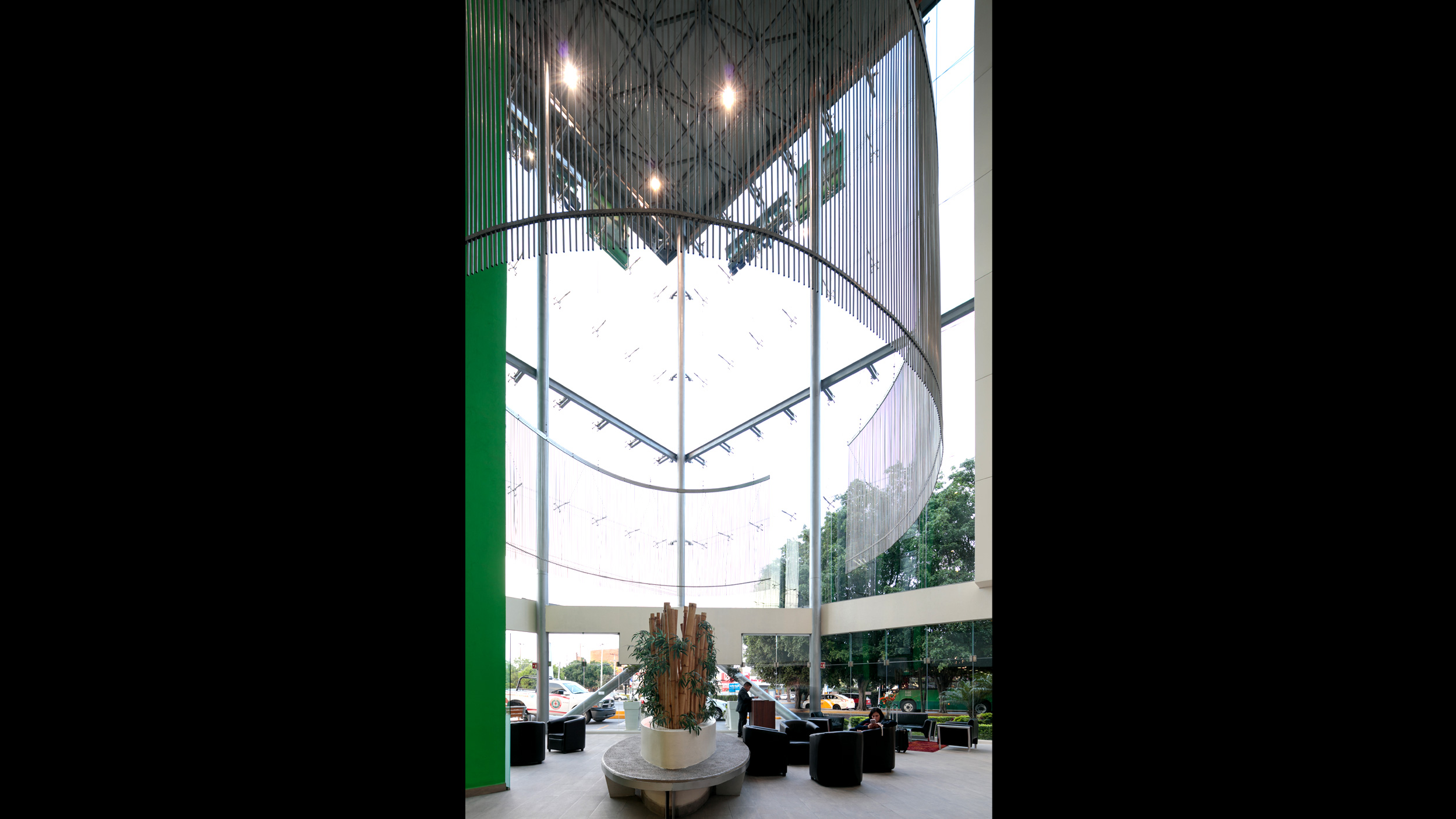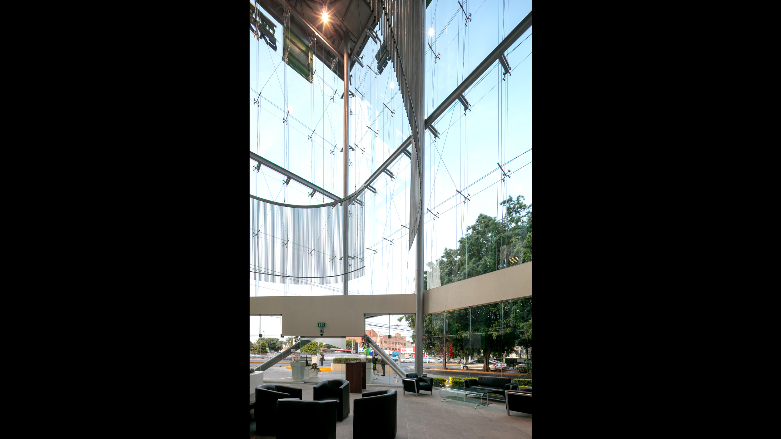 • El elemento central nace a partir de una gran caja de vidrio que, al librar todos los niveles se aprecia de noche como una gran lámpara urbana. Este espacio alberga el lobby principal y las circulaciones verticales. Esta misma caja funciona como chimenea térmica de desfogue de la ventilación natural que tienen todas las áreas comunes.