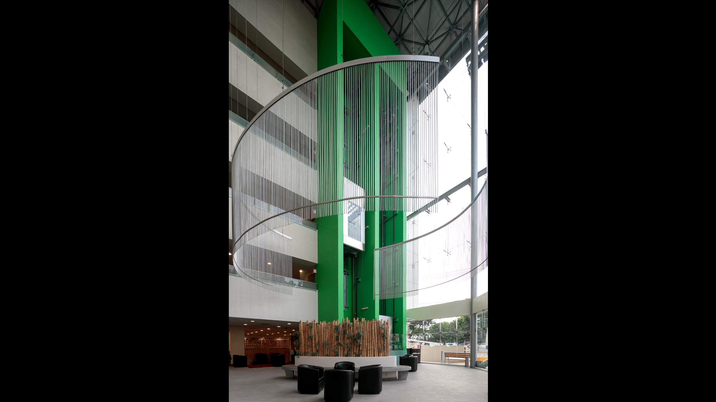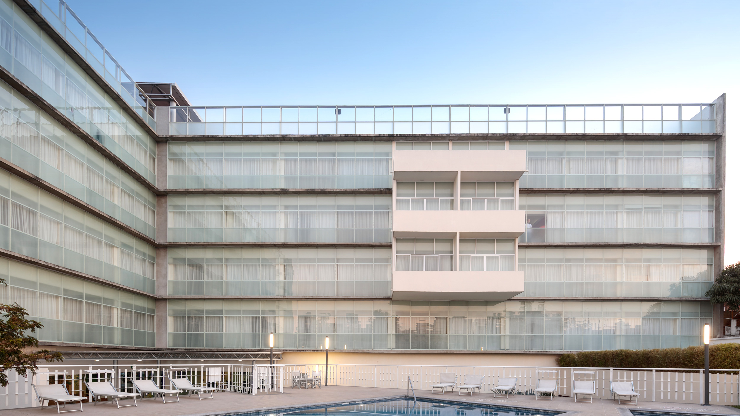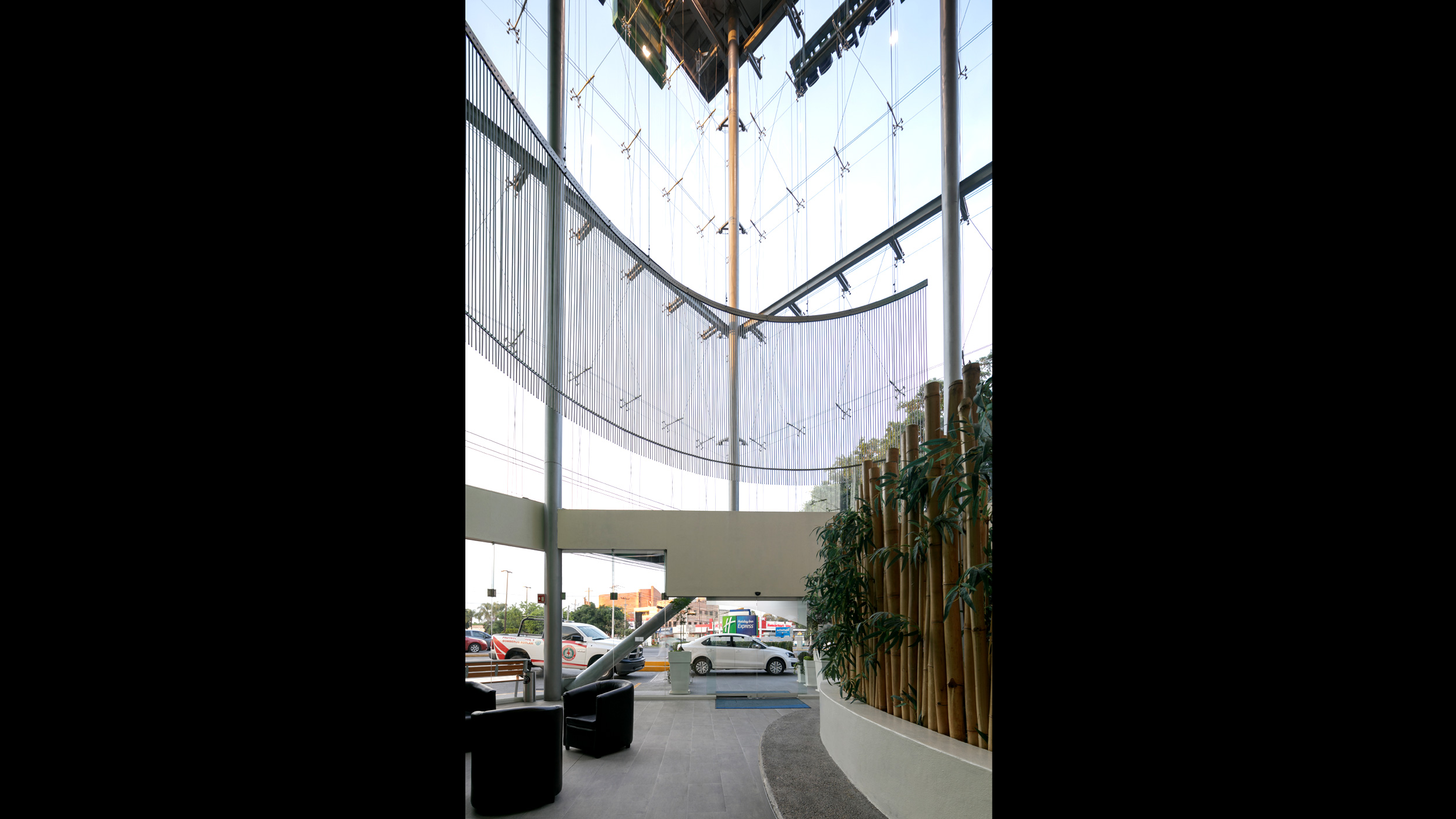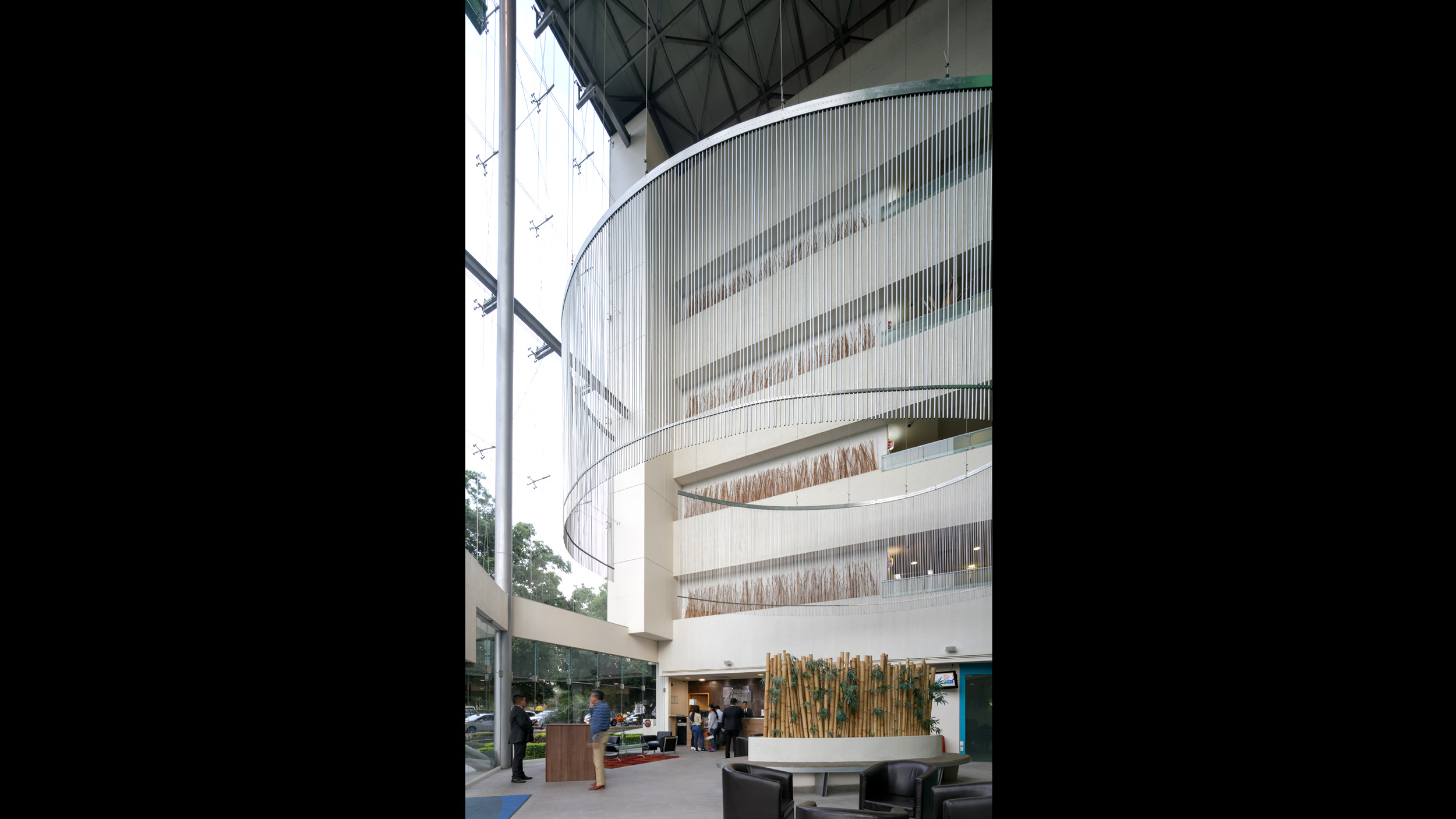 • El elemento central nace a partir de una gran caja de vidrio que, al librar todos los niveles se aprecia de noche como una gran lámpara urbana. Este espacio alberga el lobby principal y las circulaciones verticales. Esta misma caja funciona como chimenea térmica de desfogue de la ventilación natural que tienen todas las áreas comunes.