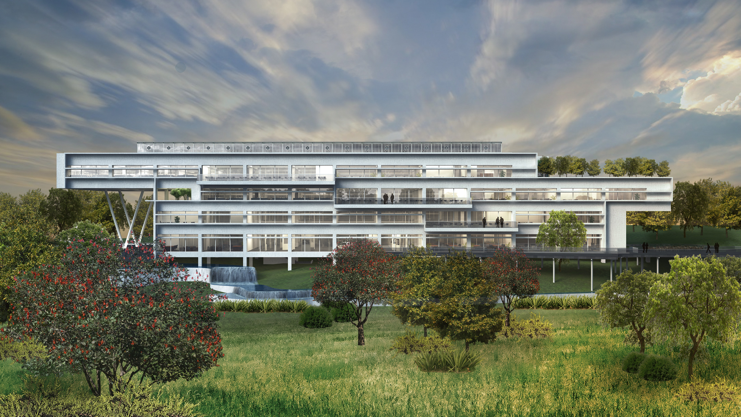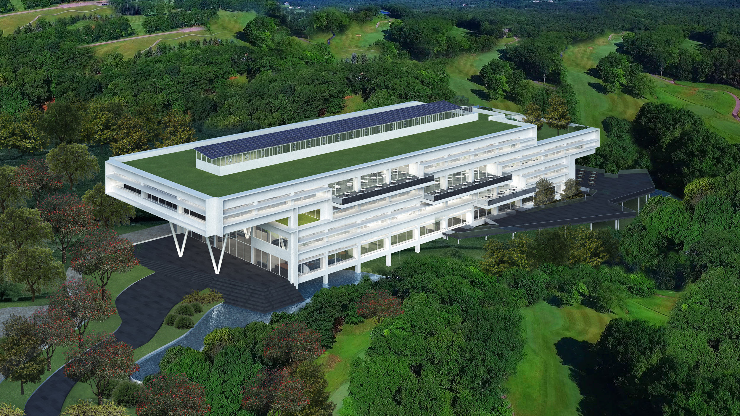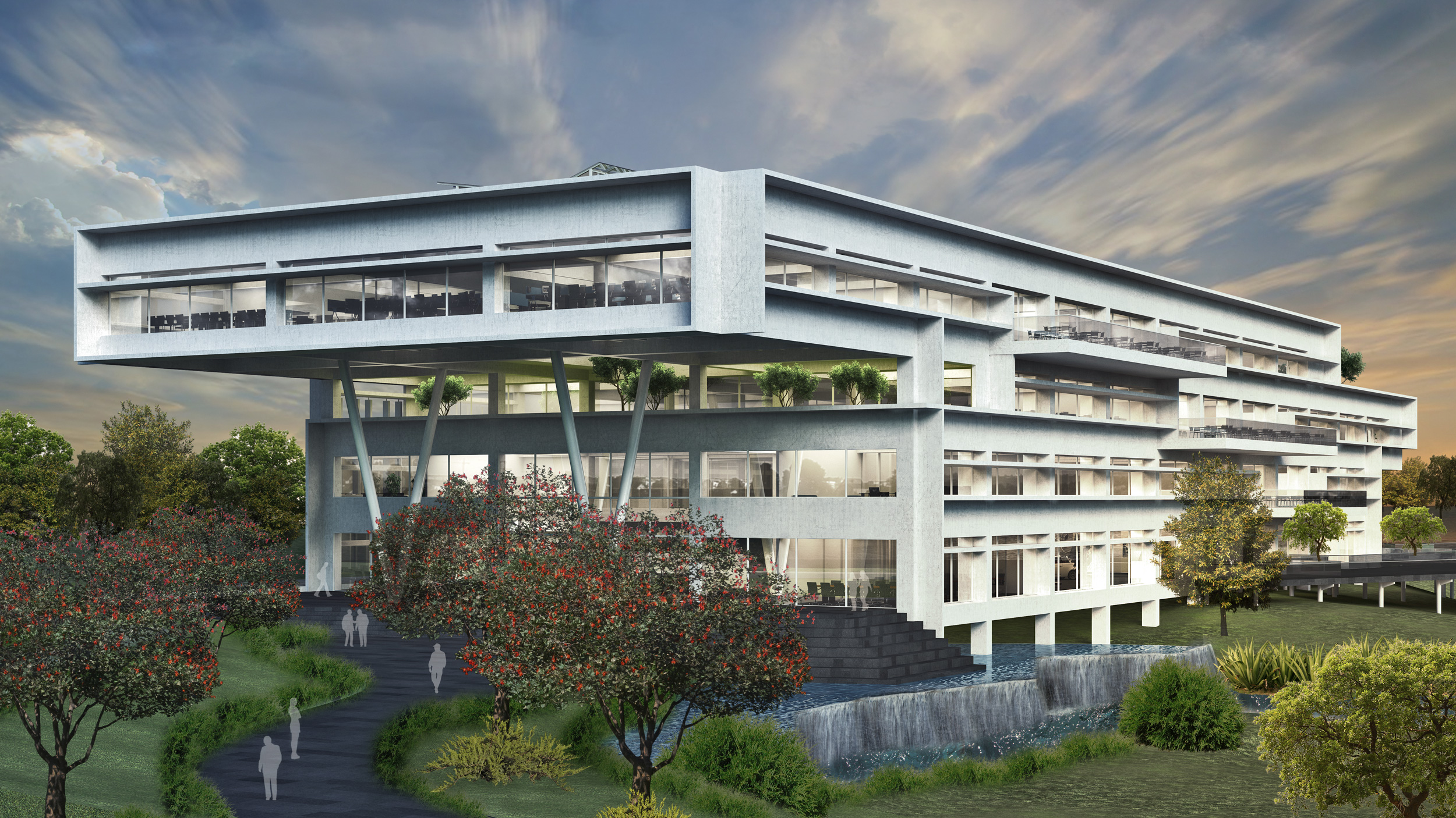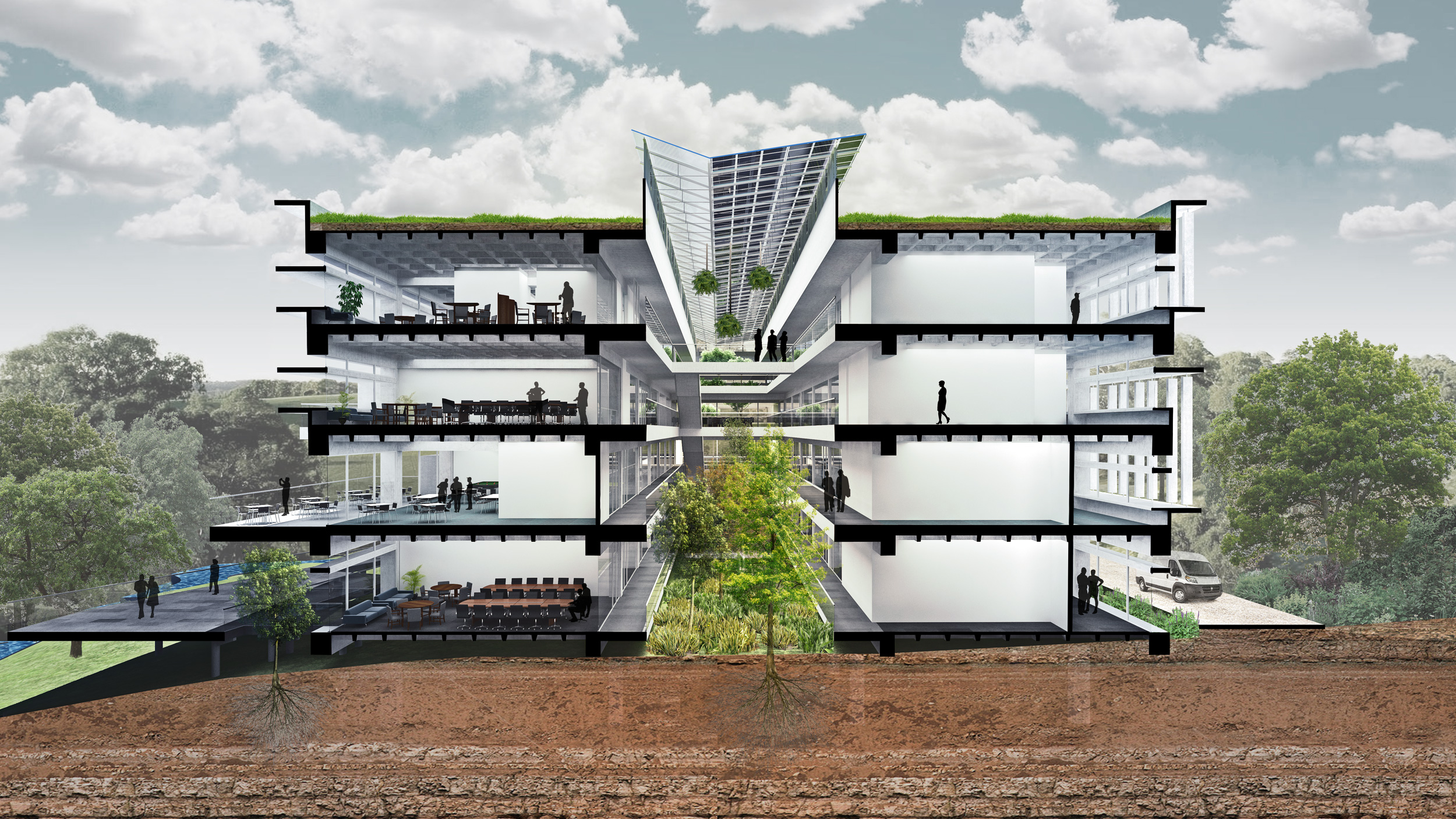 • El edificio se compone de un prisma rectangular compuesto por 4 niveles, insertado en un terreno a través de calzas elevándolo del suelo, cuidando el crecimiento interno de los árboles. Logrando con esto un gran patio inferior que funciona como eje rector del edificio, el cual tendrá como función ventilar, iluminar y dar vida al espacio interior, además de organizar las circulaciones y la relación en todos los espacios.