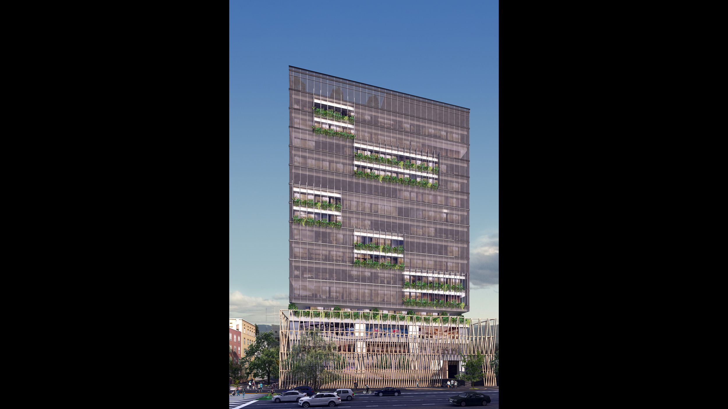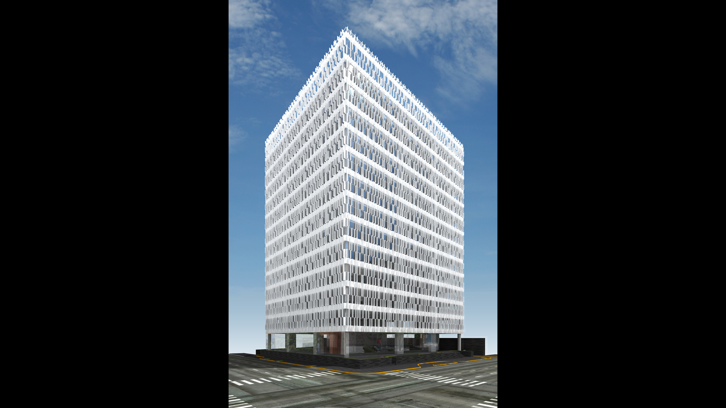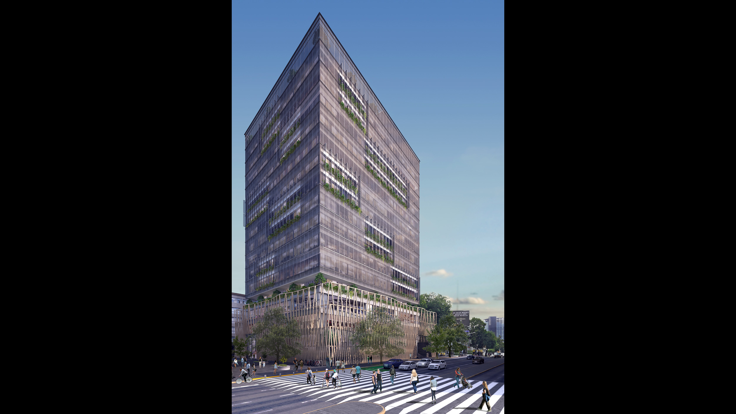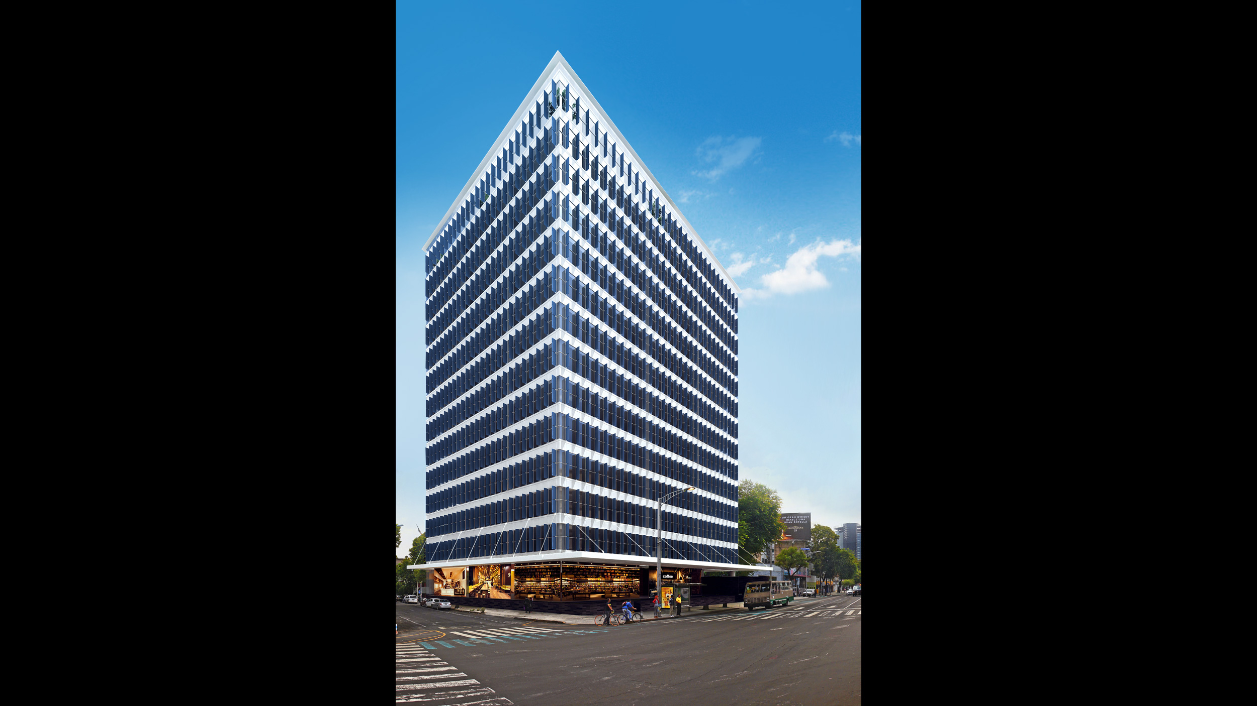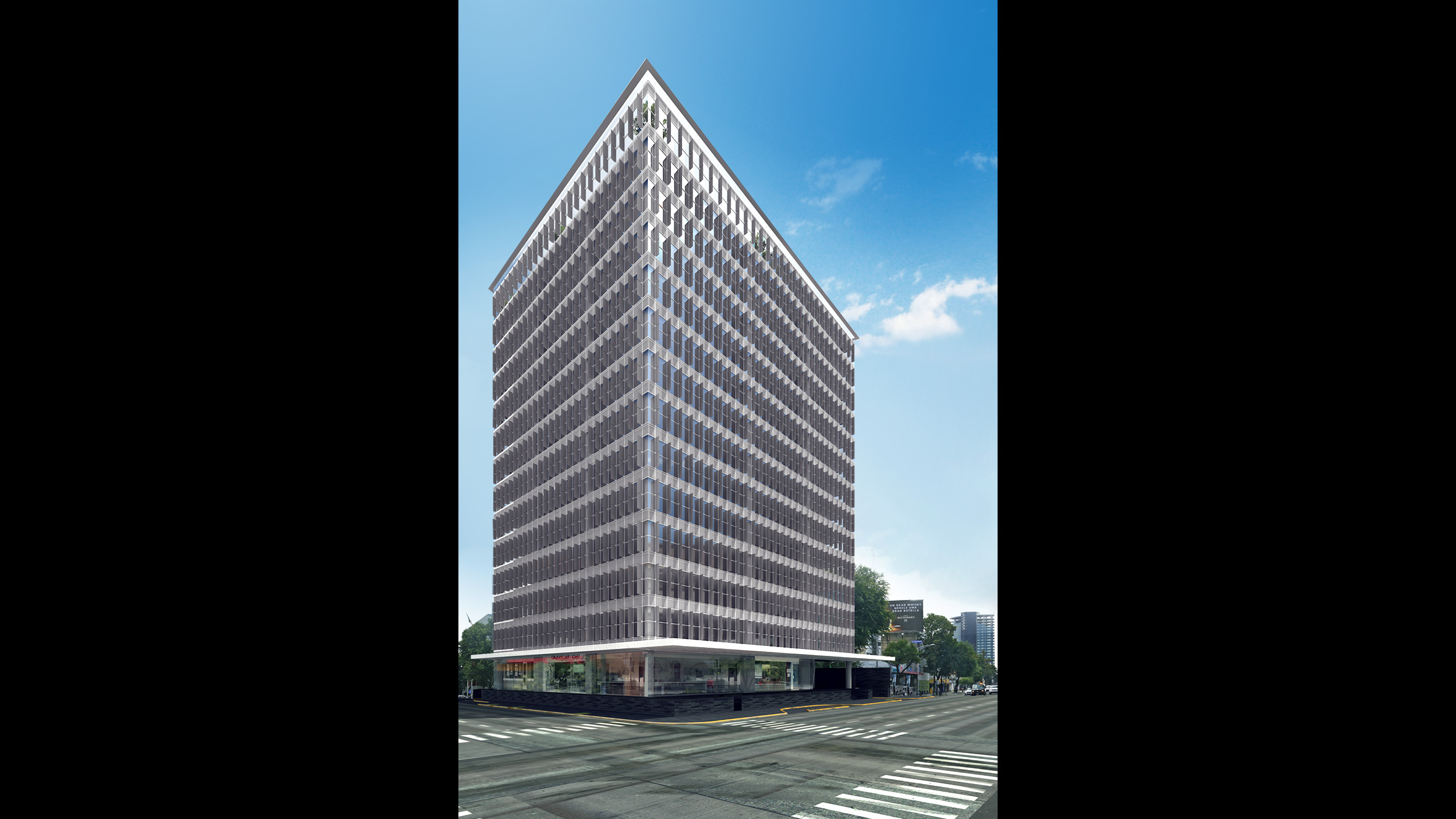 • El basamento contiene una plaza comercial y servicios, en la parte alta una torre de oficinas.