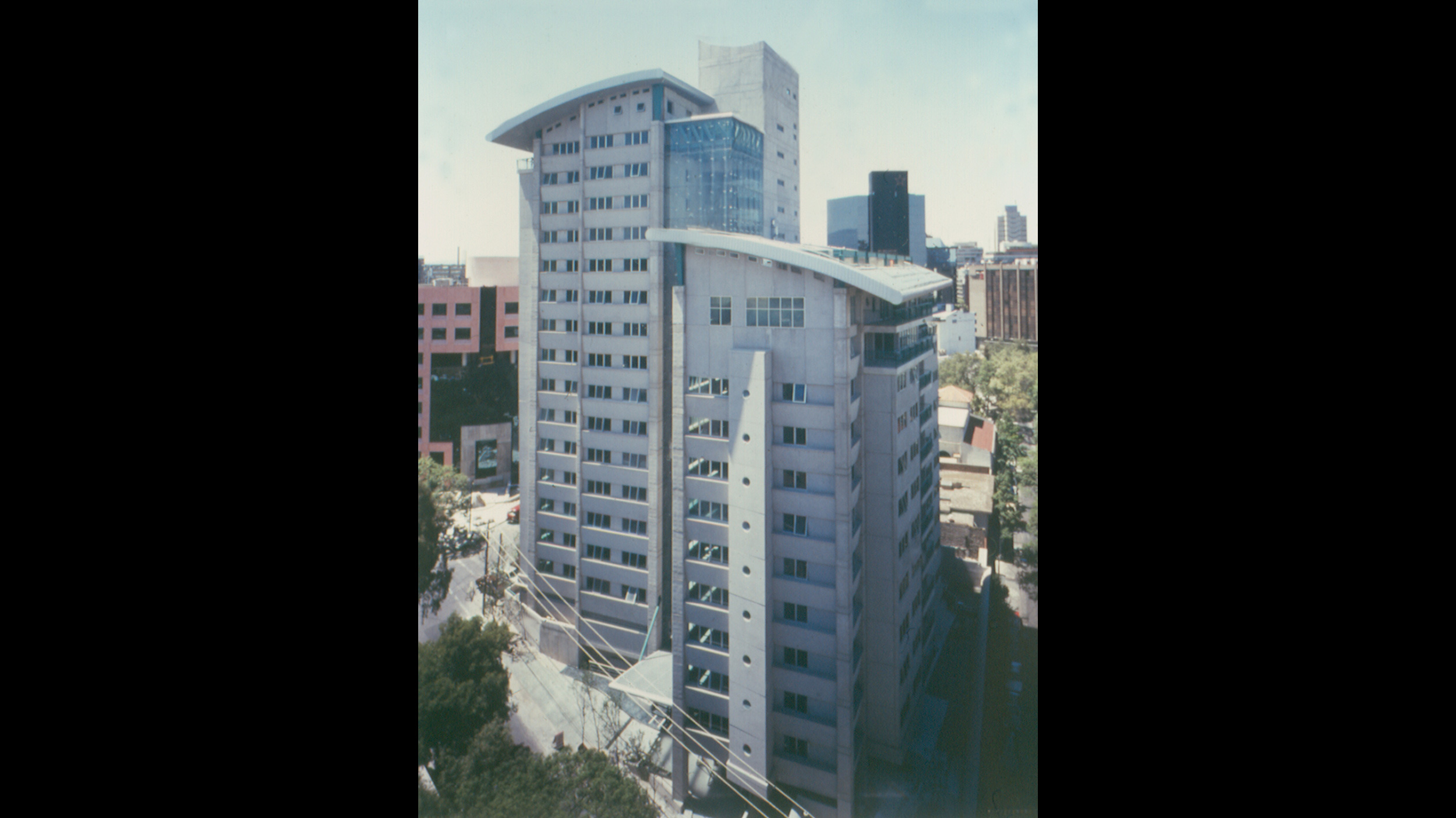 • Torre integrada por dos cuerpos unidos mediante un atrio que confina las circulaciones verticales, que incluyen vestíbulos y elevadores semipanorámicos.