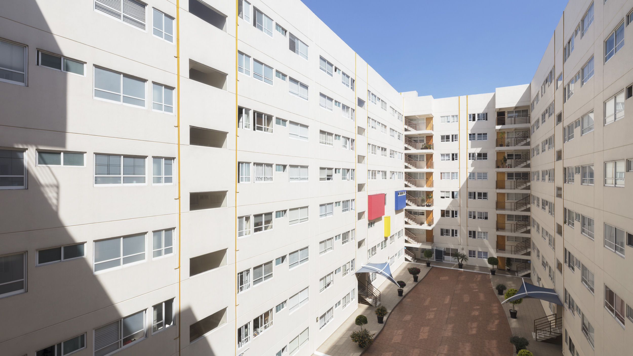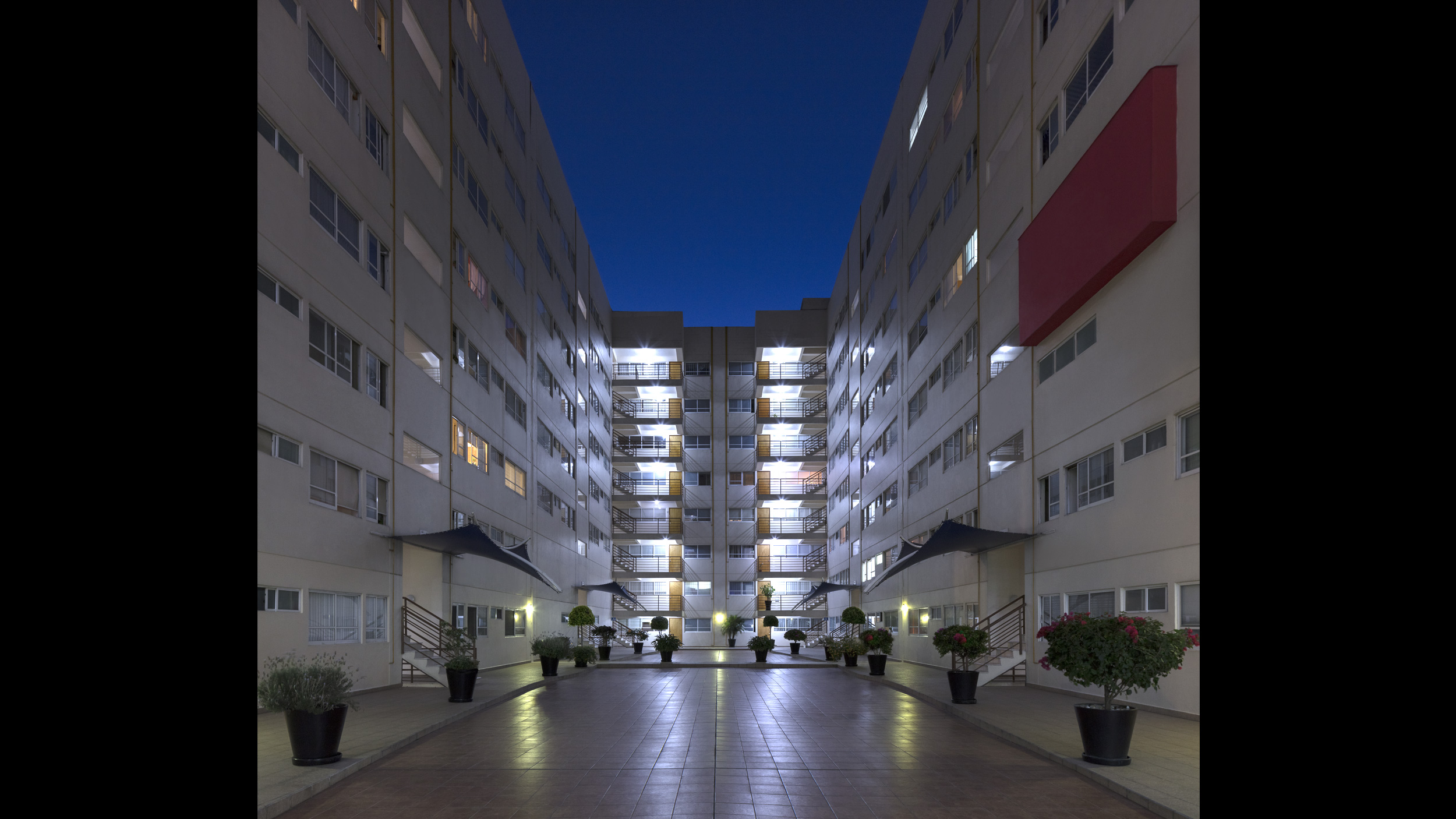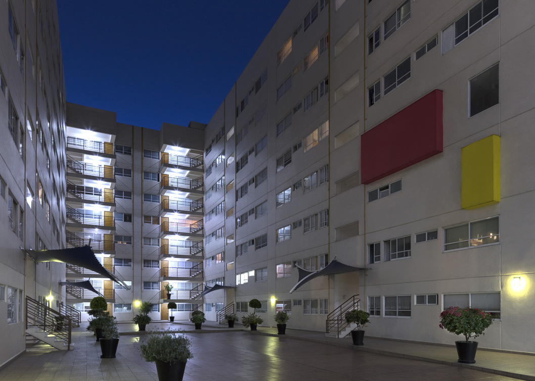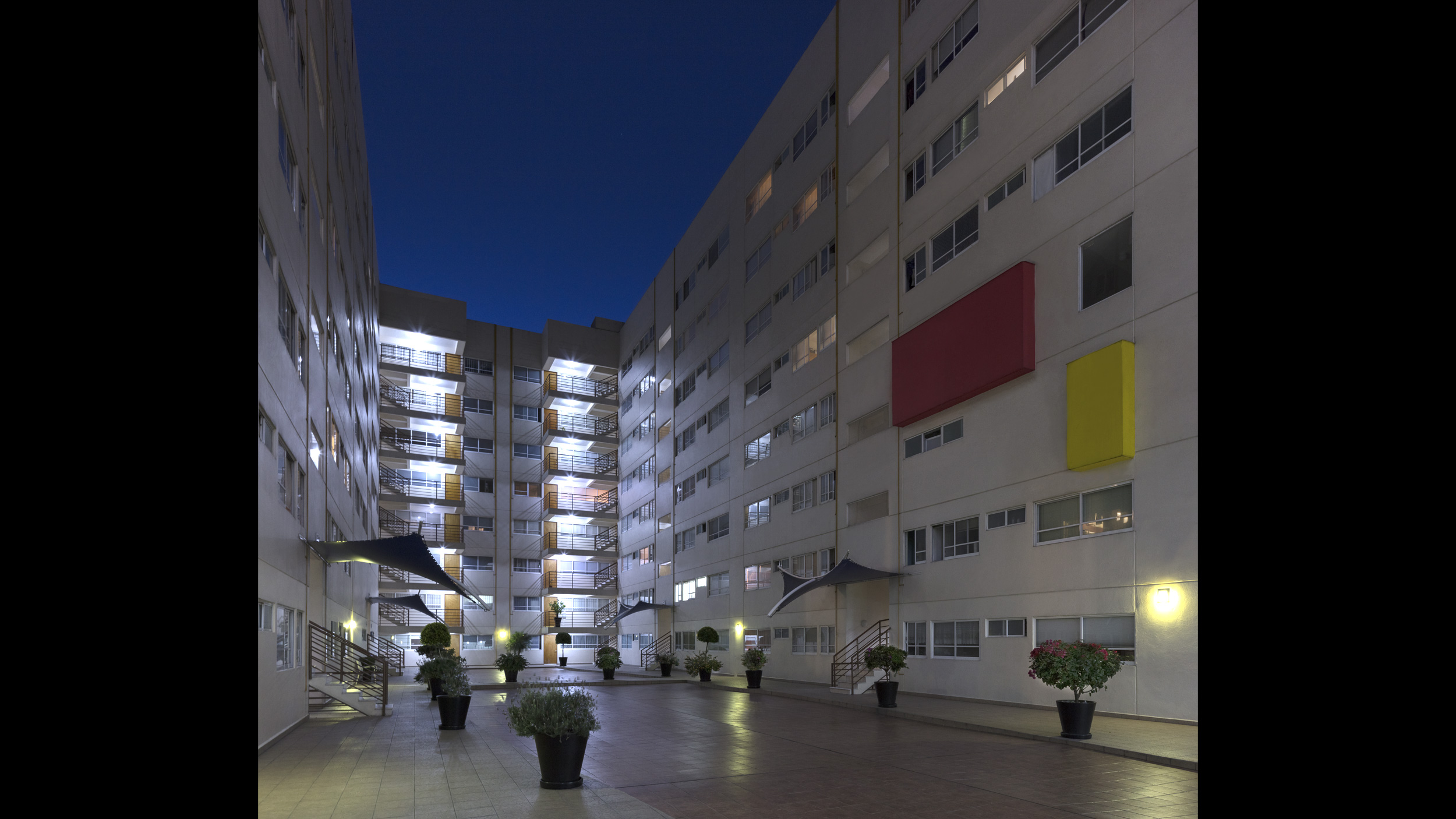 • Está conformado por cuatro bloques que giran alrededor de un gran patio central que funciona como elemento rector que organiza y gestiona todo el conjunto, permitiendo las dobles vistas y la iluminación por el lado sur de los departamentos orientados al norte.