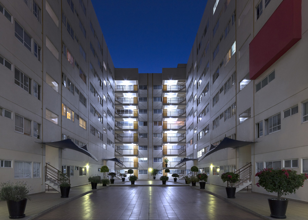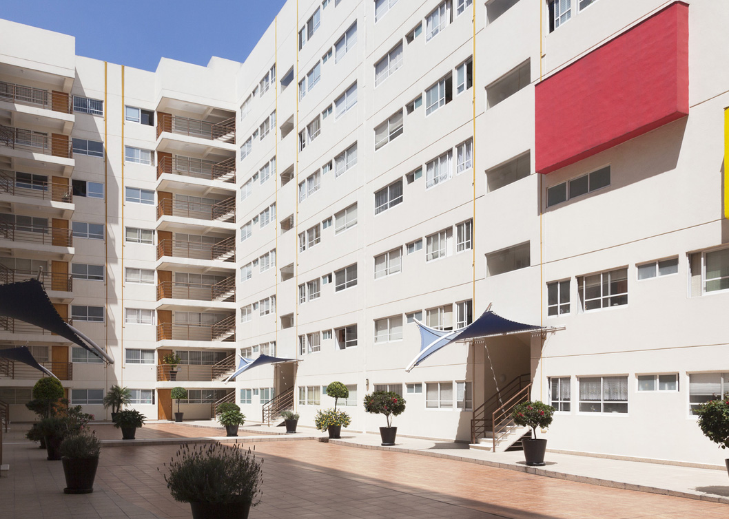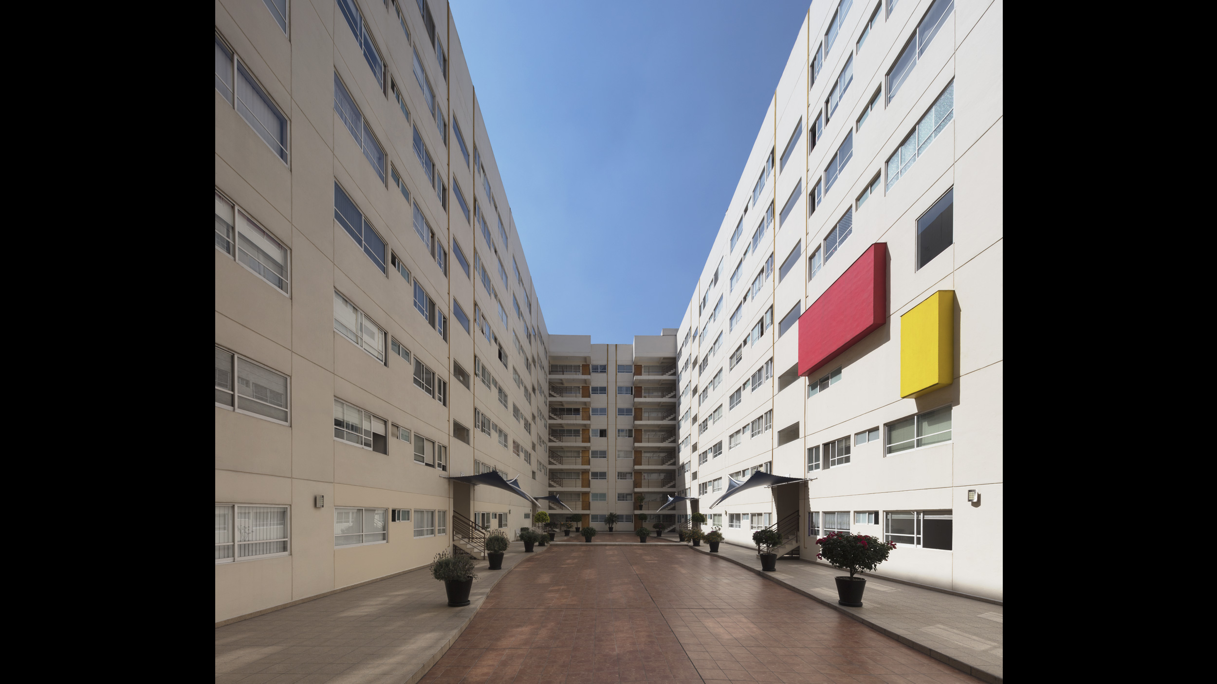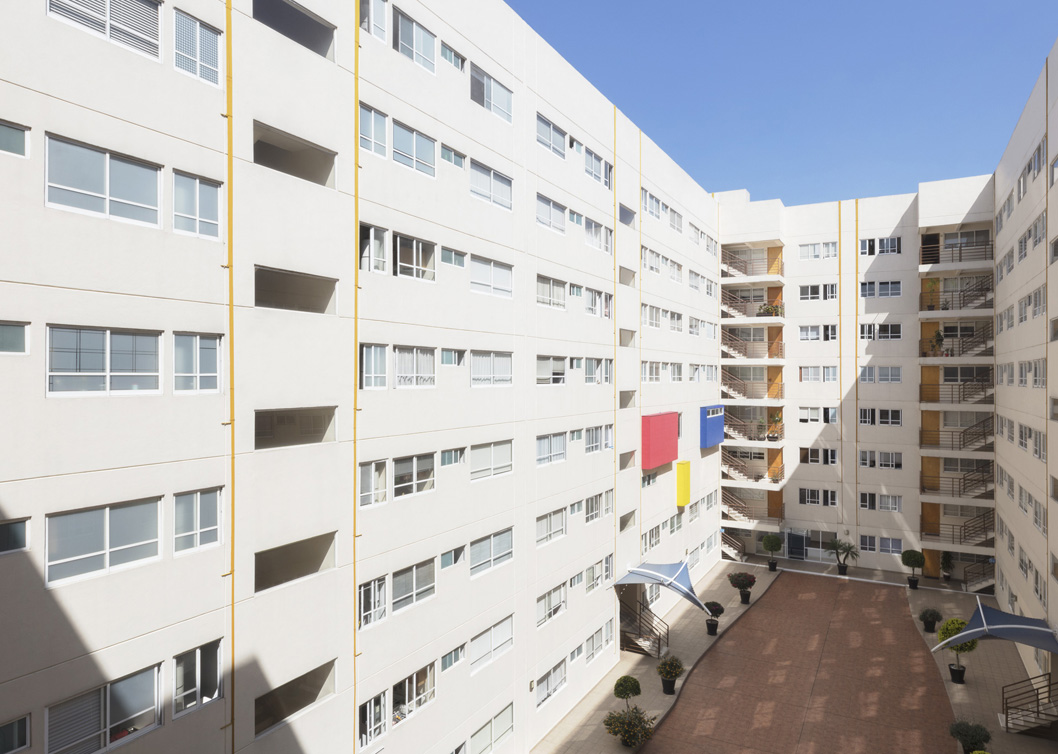 • Está conformado por cuatro bloques que giran alrededor de un gran patio central que funciona como elemento rector que organiza y gestiona todo el conjunto, permitiendo las dobles vistas y la iluminación por el lado sur de los departamentos orientados al norte.