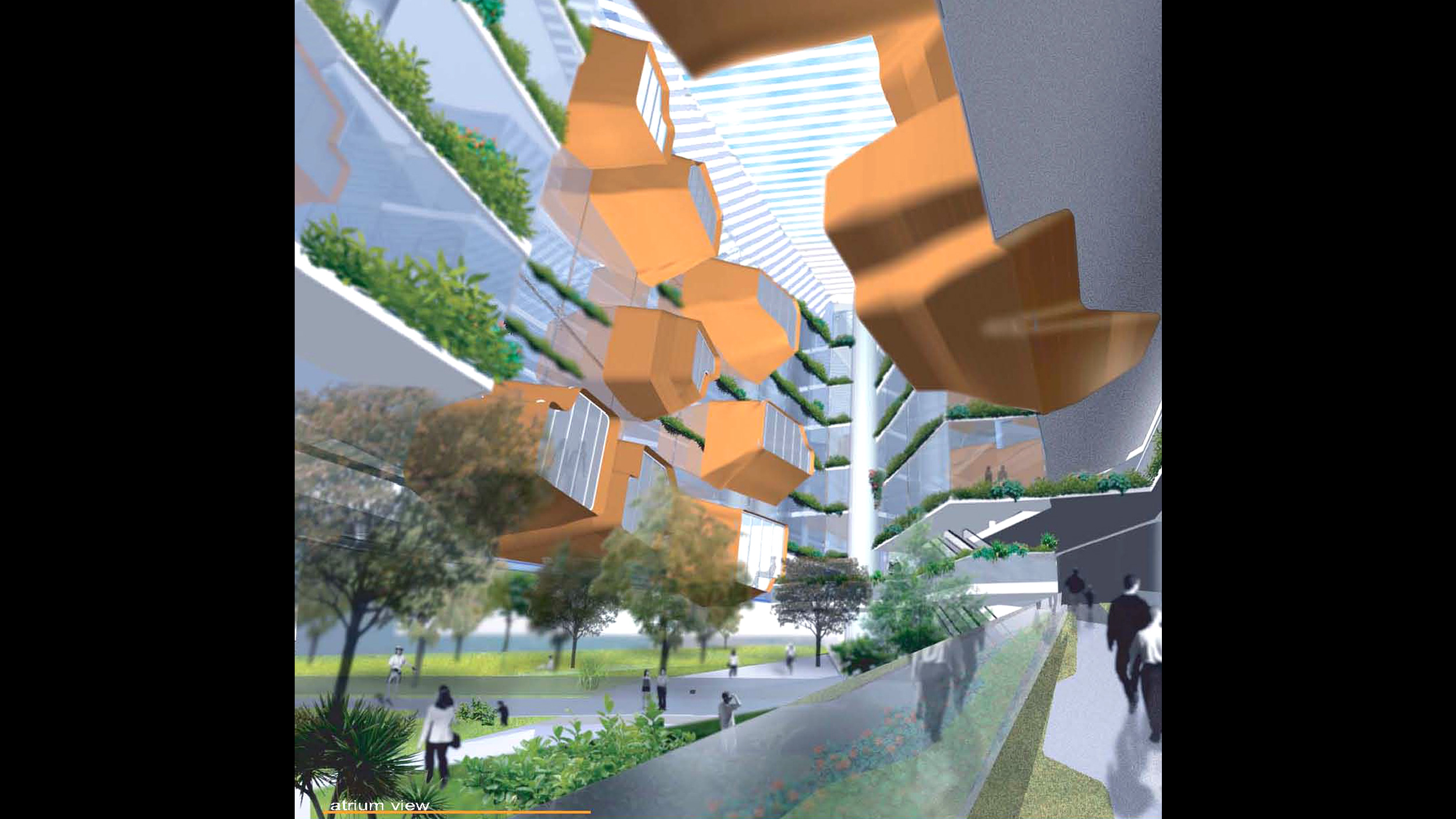 • El concepto arquitectónico incorporó rampas verdes que recorren el edificio en forma de espiral, creando una visión continua de vegetación, desde la base hasta el techo, tanto en el interior como el exterior, se pretendió elevar a 3era dimensión la plaza existente.